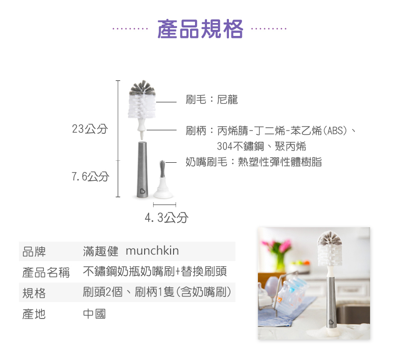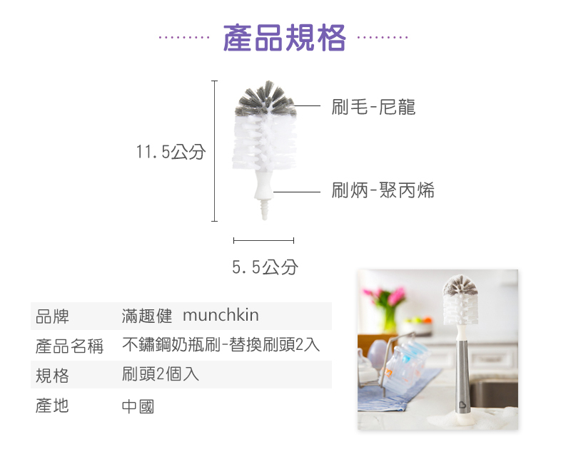 內容物:不鏽鋼奶瓶奶嘴刷+替換刷頭x1、不鏽鋼奶瓶刷-替換刷頭2入x1