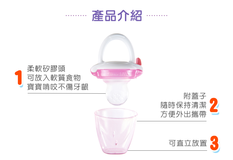 ●軟矽膠頭可放入新鮮果肉、蔬菜、泥狀食物等,讓寶寶學習自主進食的能力。