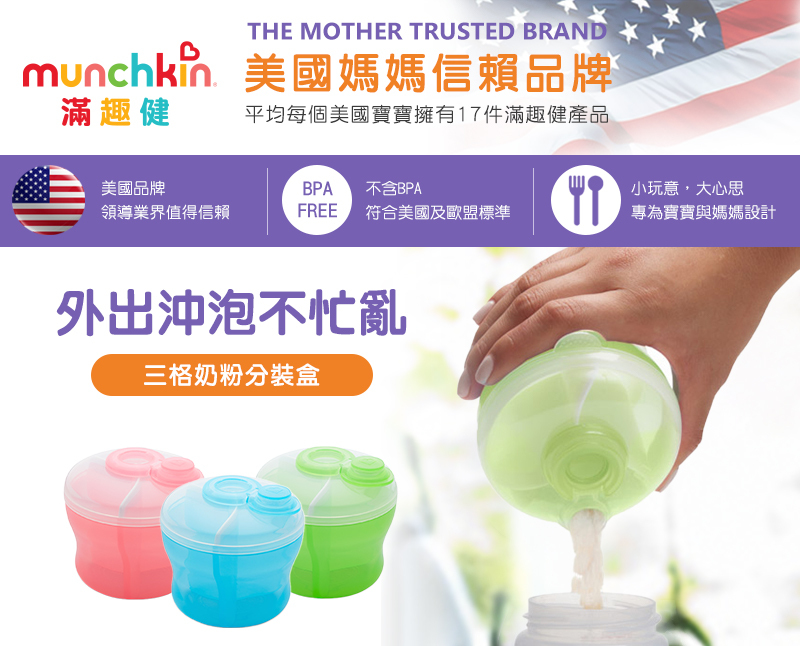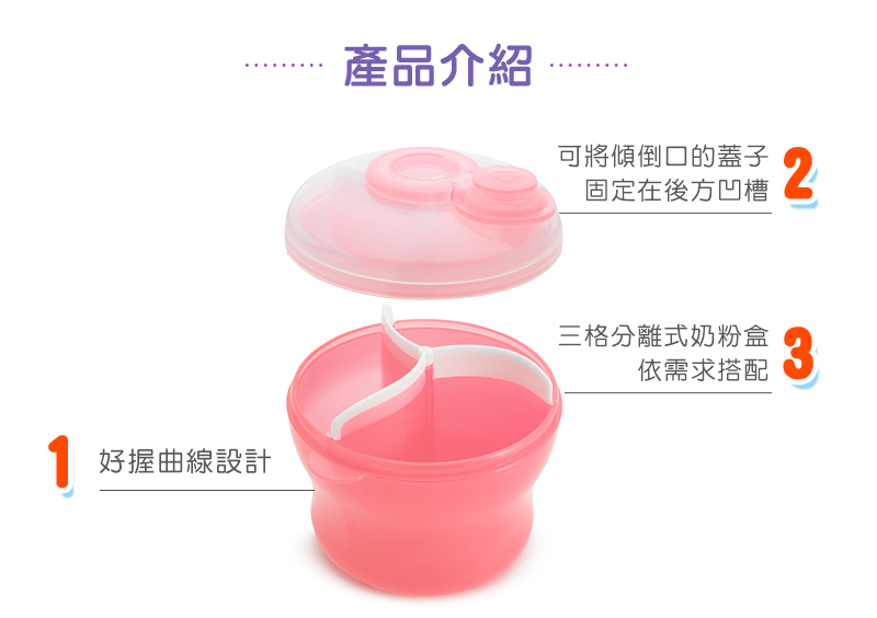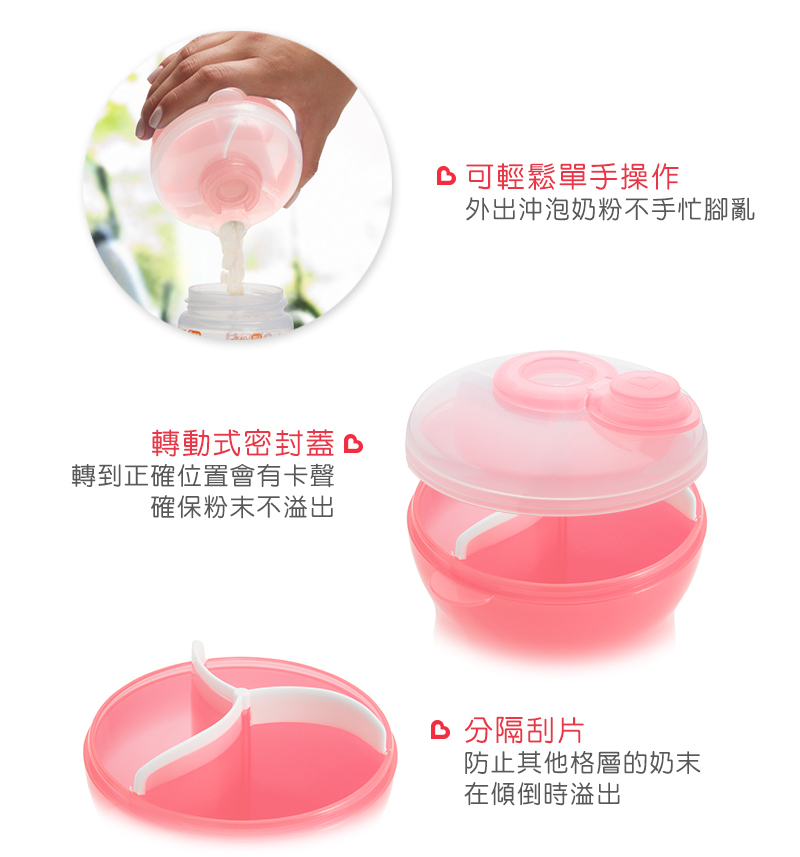 ●三格分離式奶粉盒,依需求搭配放置。