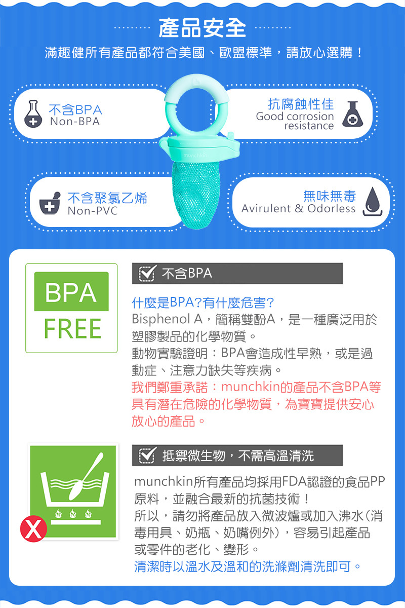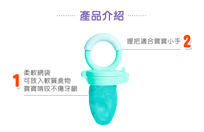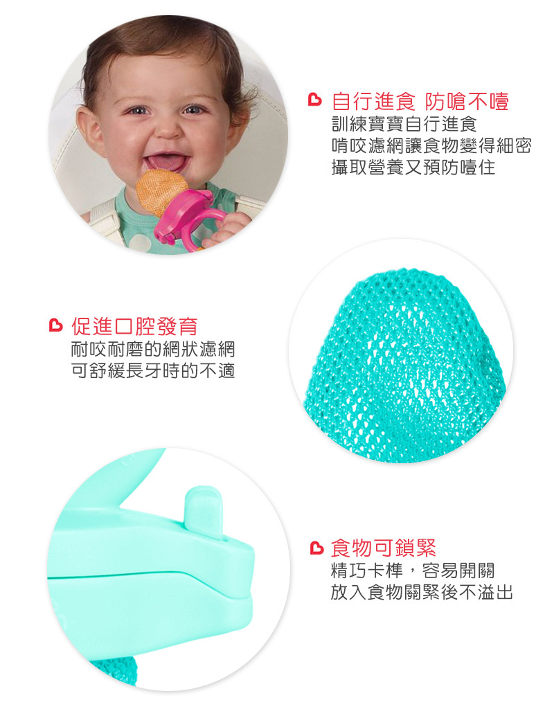 ●寶寶透過咬食濾袋、吸吮蔬果汁,滿足寶寶口慾,又能輕鬆吃到新鮮水果和蔬菜。