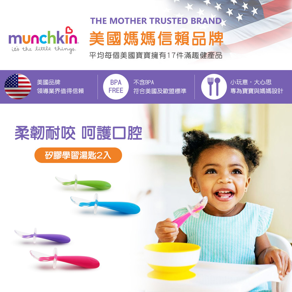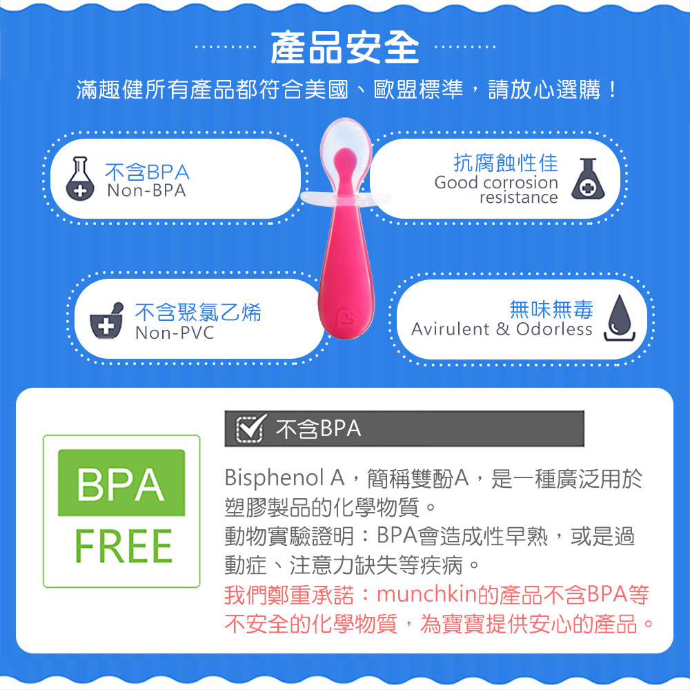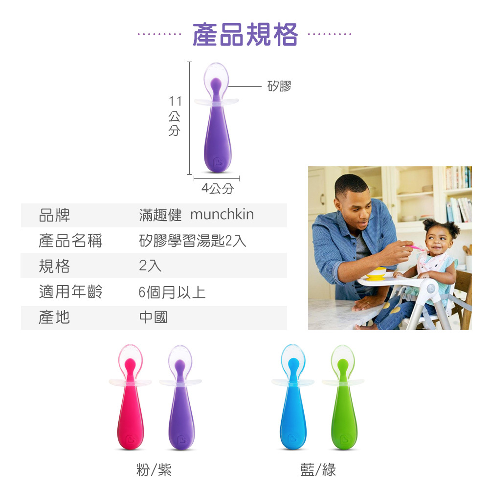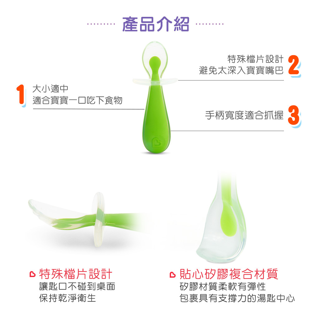●特殊檔片設計,讓匙口不碰到桌面、也避免寶寶吃飯時太深入嘴巴