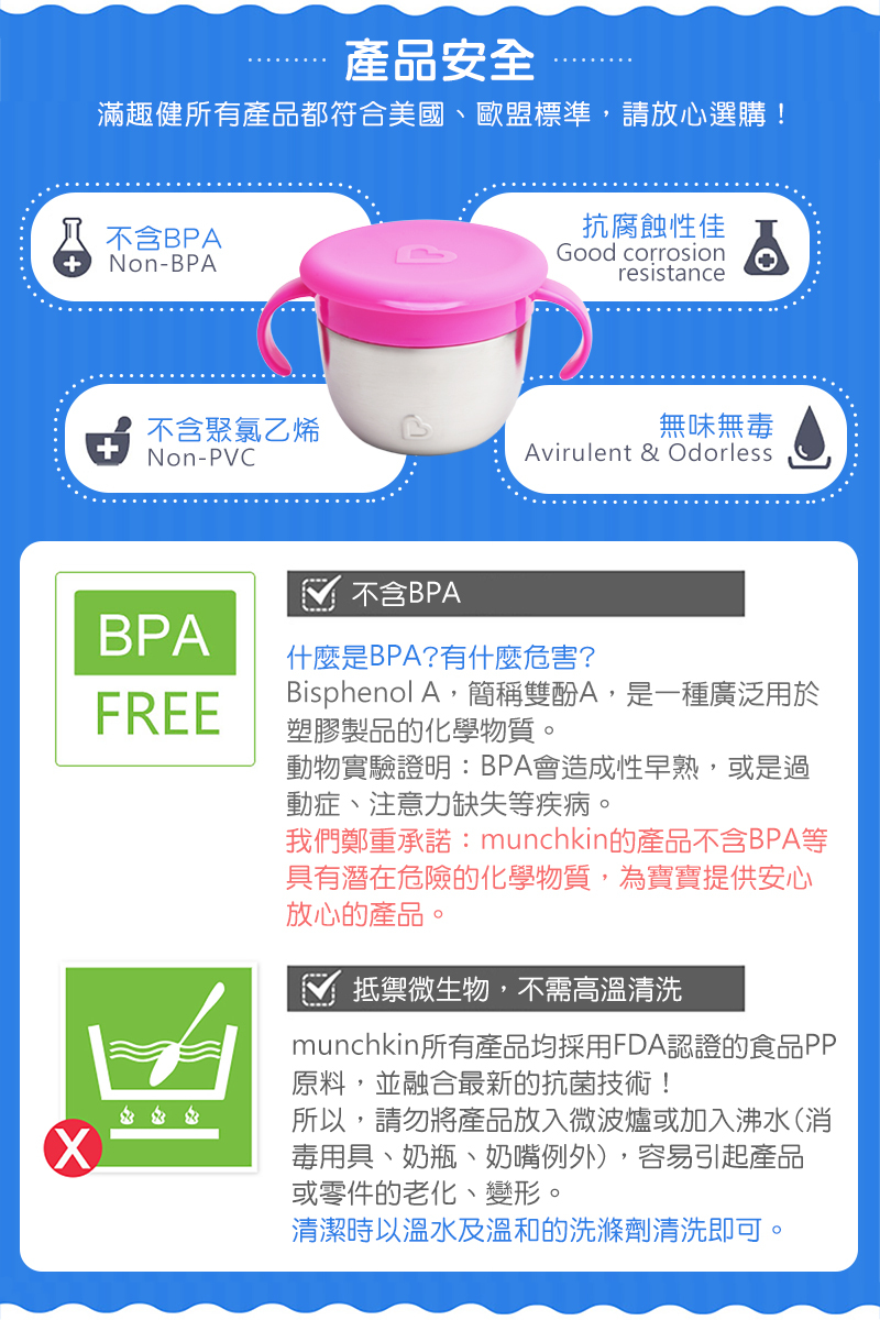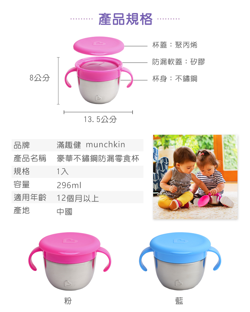 ●杯身不鏽鋼材質,重量輕、好清潔、安全耐用。
