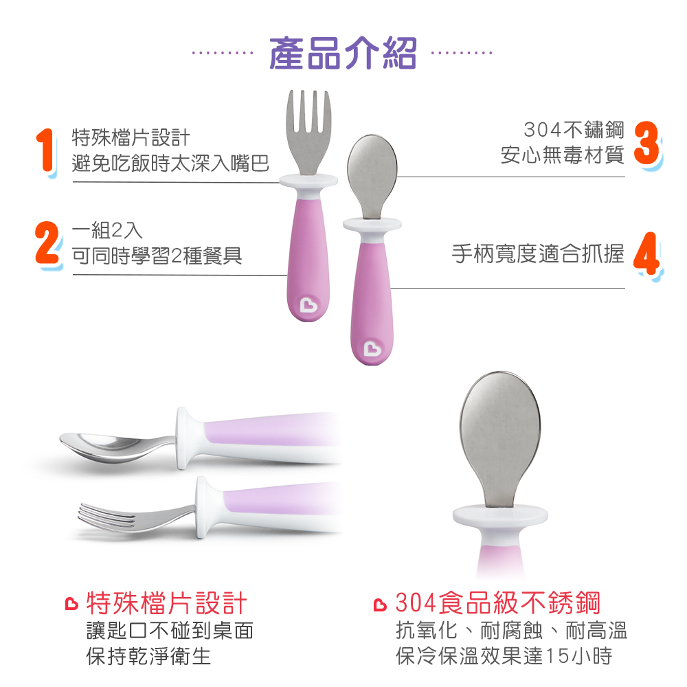 ●特殊檔片設計,讓匙口不碰到桌面、也避免寶寶吃飯時太深入嘴巴