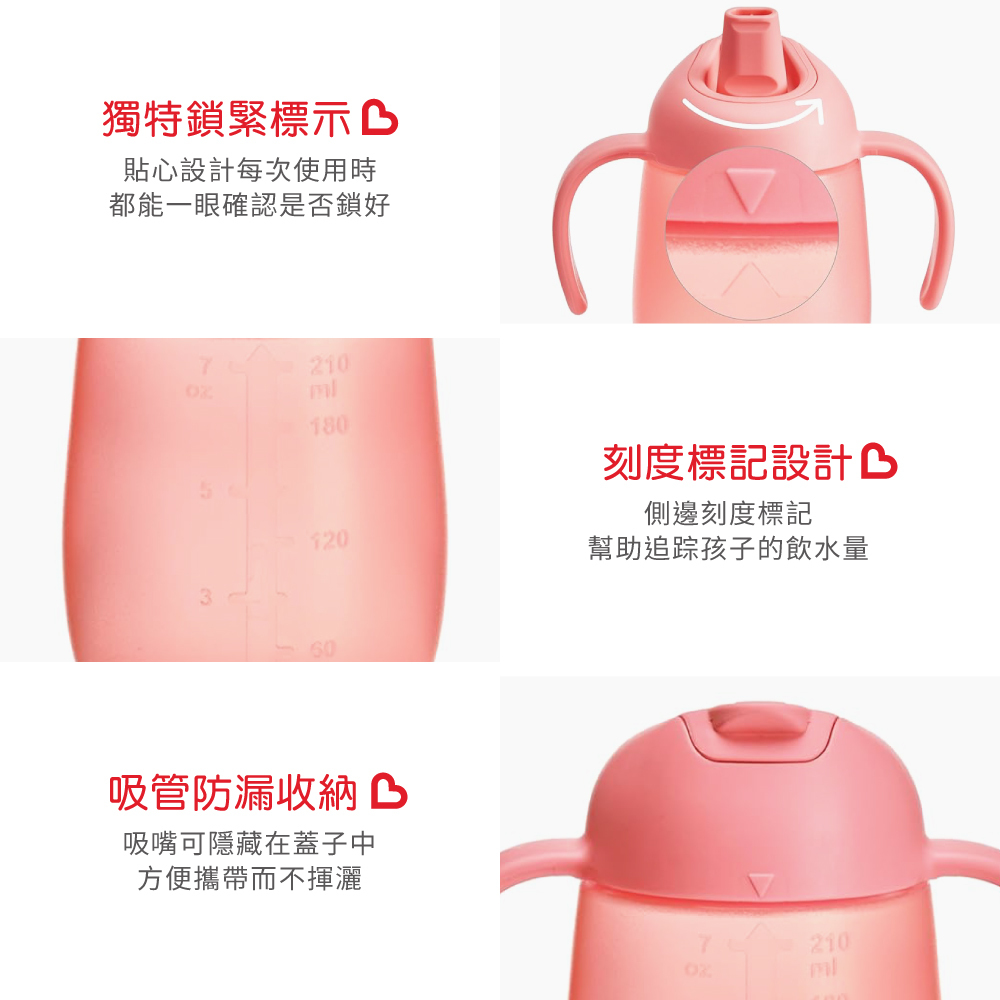 ●側邊刻度標記幫助追踪孩子的飲水量。